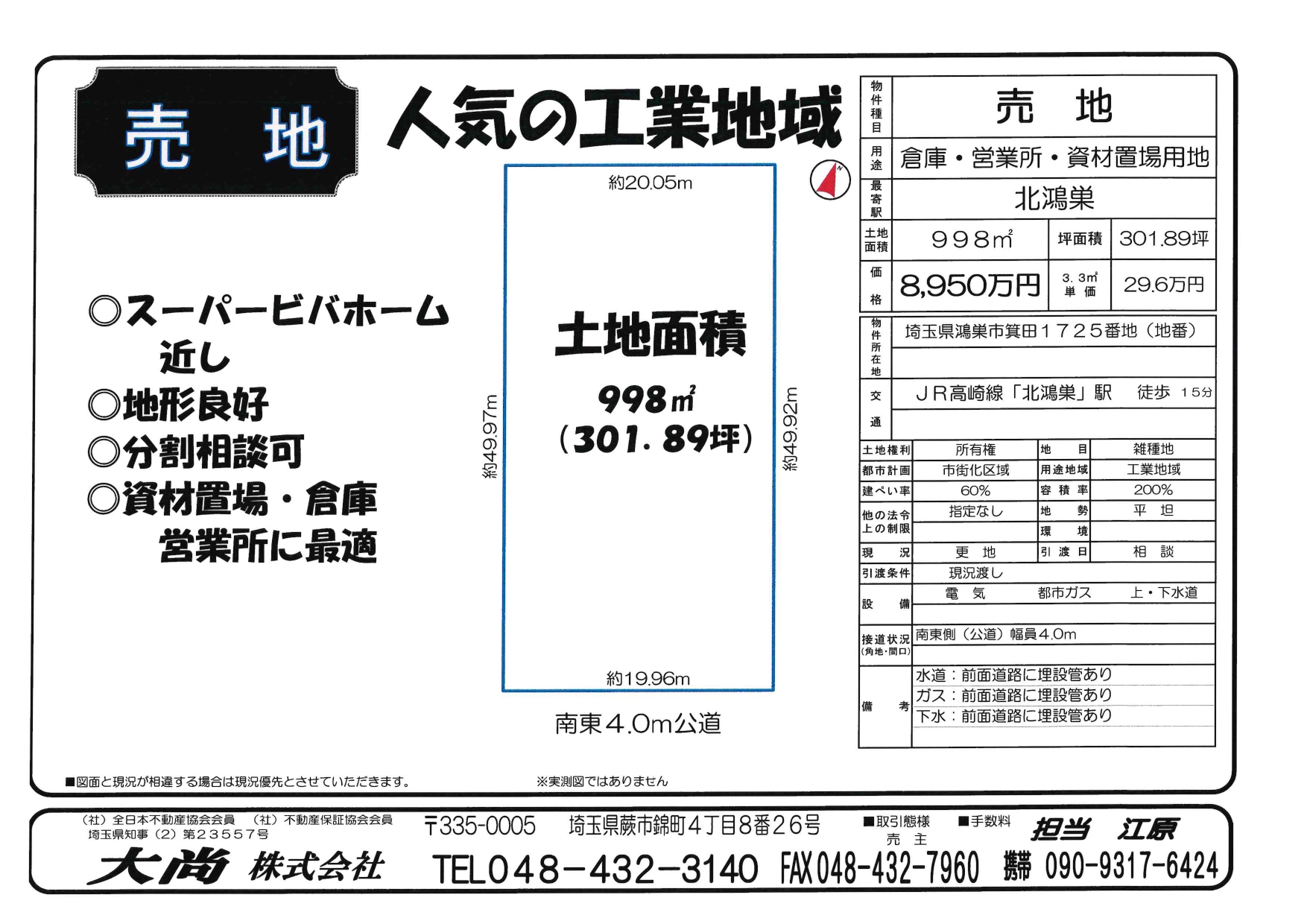 | 物件種目 | 売地(人気の工業地域) 資材置場・倉庫・営業所に最適 |